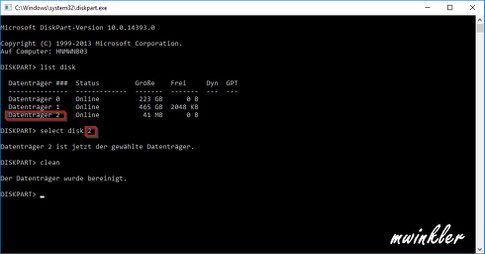Jetzt kann mit dem Befehl "select disk 2" der entsprechende Datenträger ausgewählt werden.